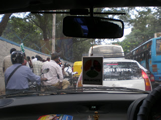 Anyway, today's post is about feeling helpless while stuff in traffic because of a political rally being held in town. Here is the view from the car, on a side street (near the IISc). I figure that once we get to the highway it will be easier. While we're stuck here, a scooter zipping between two cars breaks the side rear view mirror.